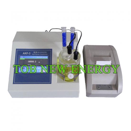 1 tob-akf-3 titration karl fischer automatiqueest un testeur d'humidité intelligent adoptant une méthode chromatique. il est principalement utilisé pour la recherche scientifique, les produits et le domaine de l'éducation, avec une grande précision et un fonctionnement simple.
